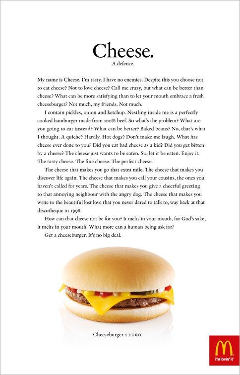 Здесь 265 слов и это, пожалуй, самый длинный текст, использованный в печатной рекламе фастфуда. Чизбургер последовательно рассказывает о своем содержимом, о том как его зовут и о прелестях сыра вообще.