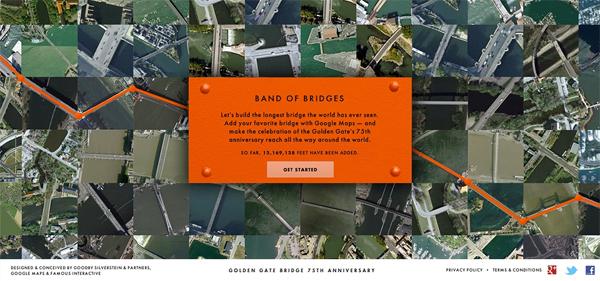 Это проект сделан к 75-й годовщине моста «Золотые ворота». Используя Google Maps API, люди могут найти свой любимый мост и связать его с мостами других пользователей.