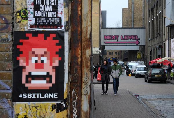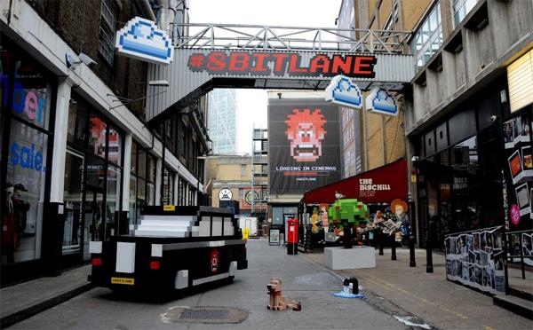 8-битная улица на лондонской Брик-Лэйн была создана в честь выхода «Ральфа» - смешного «диснеевского» мультика, премьера которого в Британии состоится 8 февраля 2013 года. Попав на Брик-Лэйн, публика смогла вдумчиво изучить 8-битное лондонское такси, почтовые ящики, голубя, облака, дерево, камеру видеонаблюдения и текущую водопроводную трубу.