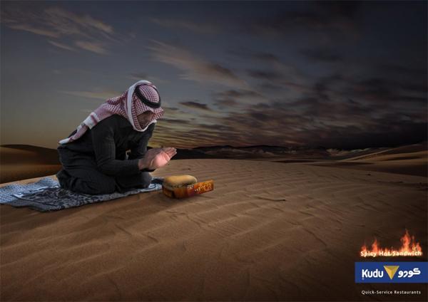 Арабская реклама часто не боится обыгрывать штампы. Здесь мы видим одетого в куфию бедуина, согревающего руки о сэндвич с курицей и специями из сетевого ресторана Kudu.