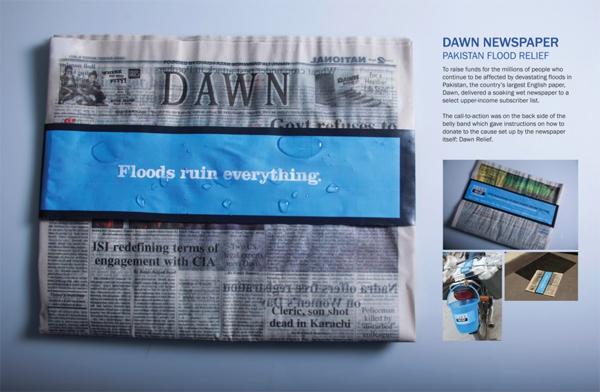 Dawn - крупнейшая в Пакистане англоязычная газета. Она доставлена богатым подписчикам в таком виде, чтобы привлечь их внимание к сбору средств для пострадавших от наводнения.