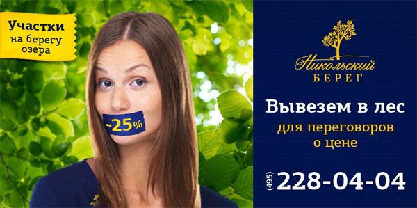 Нестандартное для рекламного рынка недвижимости решение было разработано девелопером совместно с креативной студией «Нордор». В задачу проекта вошло продвижение элитного коттеджного поселка «Никольский Берег» и выгодного ценового предложения на земельные участки. Концепция выстроена на принципе антитезы: рот девушки заклеен, но звучит призыв к диалогу, лес — это место для конструктивных переговоров, но не принудительных. Ставка сделана на то, что поселок расположен в окружении лесного массива — на берегу большого озера. Этот вид гарантировано призван обезоружить «привезенного для переговоров» клиента, а скидка в 25% поставит точку в принятии решения о приобретении участка.