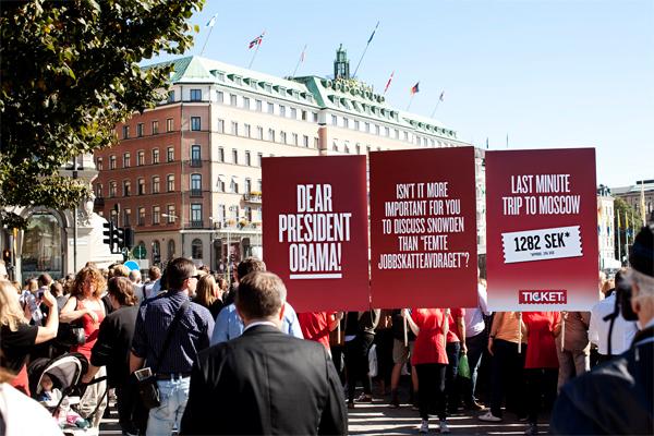 Это была акция шведского туристического агентства Ticket - Обаме давался шанс передумать и все-таки встретиться с Путиным. Всего за 196 долларов американскому президенту предлагали полететь в Россию, чтобы поговорить с президентом Владимиром Путиным, все-таки проведя отмененную из-за Сноудена несколько недель назад встречу.