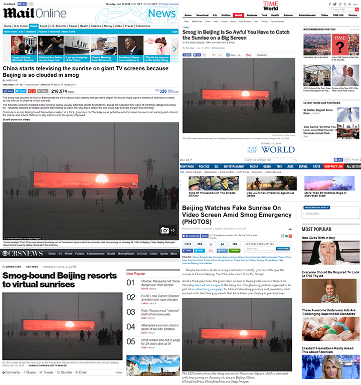 За прошедшие выходные история, начатая Daily Mail, распространилась, как вирус, среди десятков СМИ, включая Time, CBS и Huffington Post. Большинство публикаций сопровождались историями о жителях Пекина, которые вынуждены привыкать к закатам, транслируемым на огромных экранах, установленных на площади Тяньаньмэнь.