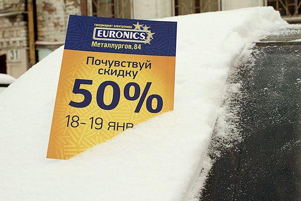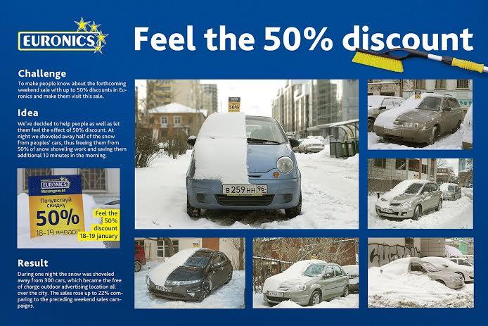 «Уральская зима - суровая и беспощадная, мало кто любит с утра в мороз чистить свою машину от снега. Мы воспользовались этим и решили помочь людям, избавив их от половины не очень приятной работы и сэкономив им дополнительные 10 минут с утра. Таким образом, мы дали людям возможность почувствовать эффект от 50% скидки».