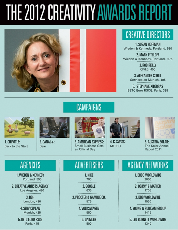 Среди самых творческих агентств 2012 года - Wieden & Kennedy, Portland, получающее награду третий год подряд. До первого места агентство доросло в 2011 году - благодаря масштабной кампании для Old Spice. Однако в этом году агентство завоевало первое место благодаря более сбалансированному ассортименту рекламной продукции. Продолжив работу для P&G и Old Spice, W&K разработало отличные кампании также для Nike, Chrysler, Coca-Cola и Levi's. На втором месте расположилось CAA Marketing.И, при всей нехватке женщин-руководителей в индустрии, обратите внимание на то, что самым чествуемым руководителем года в этом году оказалась именно женщина - Сюзан Хоффман из W&K. Это не первое ее появление в хит-параде, но в этом году она впервые не разделила его вершину вместе со своим коллегой - исполнительным креативным директором W&K Марком Фитцлоффом, который занял второе место.
