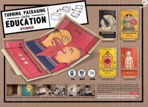 Colgate разработала для школ в Мьянме серию образовательных плакатов, созданных в традиционном стиле бирманской иллюстрации. Иллюстрации были выполнены на внутренней стороне коробок, в которых паста доставлялась в самые отдаленные сельские школы страны.