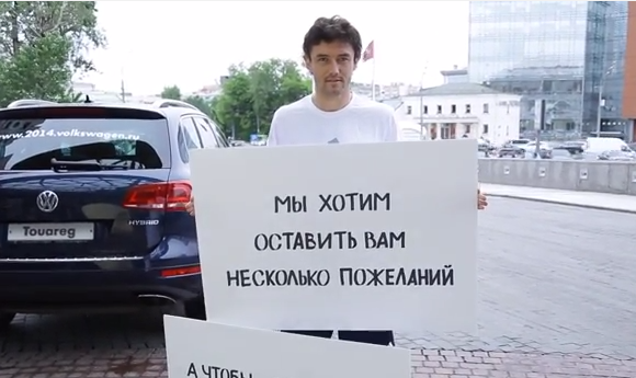 На официальном канале Volkswagen Russia в YouTube появился забавный рекламный ролик «Срочное обращение сборной России по футболу к болельщикам». В нем члены национальной сборной России на ЧМ 2014 – Юрий Лодыгин («Зенит», Санкт-Петербург), Дмитрий Комбаров («Спартак», Москва), Алан Дзагоев (ЦСКА, Москва), Виктор Файзулин («Зенит», Санкт-Петербург), Юрий Жирков («Динамо», Москва), Александр Кокорин («Динамо», Москва), Александр Кержаков («Зенит», Санкт-Петербург), Денис Глушаков («Спартак», Москва) и Георгий Щенников (ЦСКА, Москва) – обращаются к своим болельщикам с любопытными просьбами, скрывающими в себе немало «футбольных» подвохов.