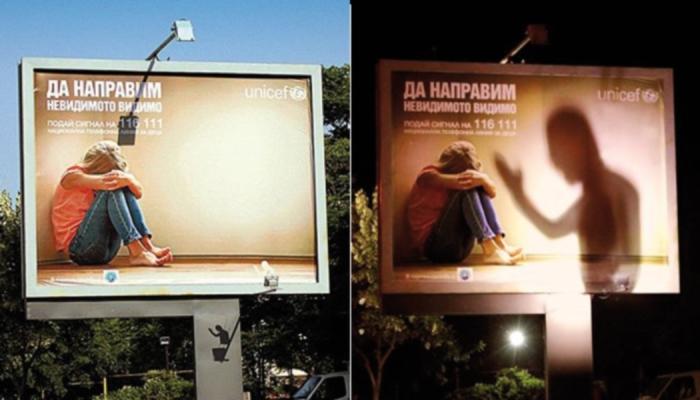 В рамках рекламной кампании «Делая незримое видимым» UNICEF Bulgaria разработала необычный билборд, с помощью которого показала, что насилие над детьми происходит чаще всего в темное время суток. Внизу билборда прикреплена маленькая фигурка человека. Когда наступает ночь, и включается подсветка, фигура отбрасывает тень, создавая образ взрослого, поднявшего руку на ребенка.