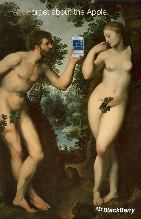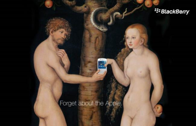 В картинах таких мастеров живописи, как Питер Рубенс и Лукас Кранах Старший, компания меняет всего одну деталь. Вместо запретного яблока, сорванного Евой, в руках Адама оказывается новый смартфон Blackberry Q10. «Забудьте о яблоке» – гласит слоган кампании. Очевидно, что таким образом Blackberry решила потроллить своего небезызвестного «яблочного» конкурента.