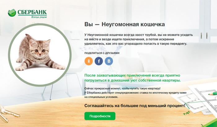По социальным сетям распространился тест «Какая вы кошечка?», который оказался рекламой ипотеки Сбербанка. В нем предлагается ответить на простые вопросы, к примеру, о том, как вы предпочитаете спать, что вас выводит из себя, чем вы обычно заняты в марте и другие. По результатам ответов робот определяет, какая вы кошечка. Можно стать котом-царем, обаяшкой, оркестром и т.д.