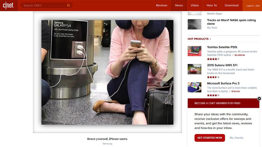 Компания Samsung начала новый этап рекламной кампании, в которой в очередной раз ударила по больным точкам конкурентов. На этот раз южнокорейский производитель разместил в нескольких американских аэропортах постеры с рекламой флагманского смартфона Galaxy S5