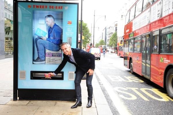 На автобусных остановках Лондона появились рекламные конструкции, в которых прохожие могут бесплатно получить пачку чипсов Walkers. Для этого необходимо написать твит с хештегом #walkers_busstop. Всего в Лондоне установлено три таких автомата, каждый из которых ежедневно раздает 260 пачек.
