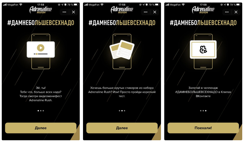 На площадке Instagram бренд предлагает пользователям рассказать собственную историю о том, как они преодолели свой жизненный страх, и доказать аудитории, почему им #БольшеВсехНадо. Примером выступают блогеры, комики, спортсмены и инфлюенсеры, среди которых Данила Поперечный, Илья Соболев, Дмитрий Игнатов. Adrenaline Rush будет следить за историями пользователей под хештегом #БольшеВсехНадо и добавлять самые мотивирующие рассказы в свою рекламную кампанию.