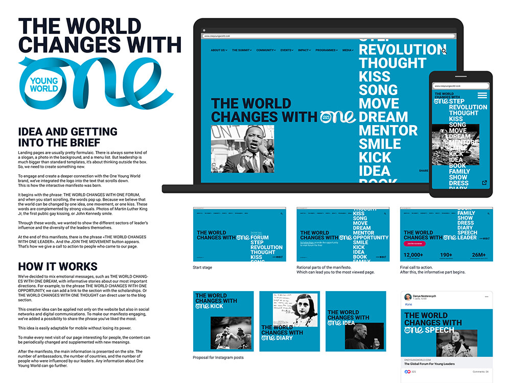 Украинские проекты завоевали две награды на фестивале. Золото в категорииYoung Lions Design получили креативщики из агентств Bickerstaff и Banda Agency.Они занимались оформлением сайта всемирного форума One Young World, гдесобираются самые талантливые представители молодого поколения для обсуждениямировых проблем. Проект получил название The World Changes With One — окончаниефразы меняется, передавая разные посылы, отражающие дух события.
