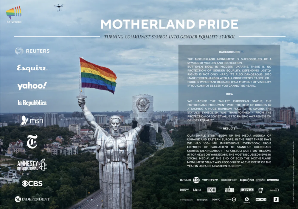 Серебро в Outdoor Lions досталось проекту Motherland Pride организацииKyivpride и Saatchi & Saatchi Ukraine. В честь прайда монумент«Родина-мать» был украшен радужным флагом, который прикрепили к статуе спомощью дрона. Об акции было рассказано в соцсетях под хештегом#Матизрозумієтапідтримає («Мать поймет и поддержит»). Одновременно с этим вGoogle Maps была созданаальтернативная карта, где можно было оставить метки слозунгами в поддержку ЛГБТ.