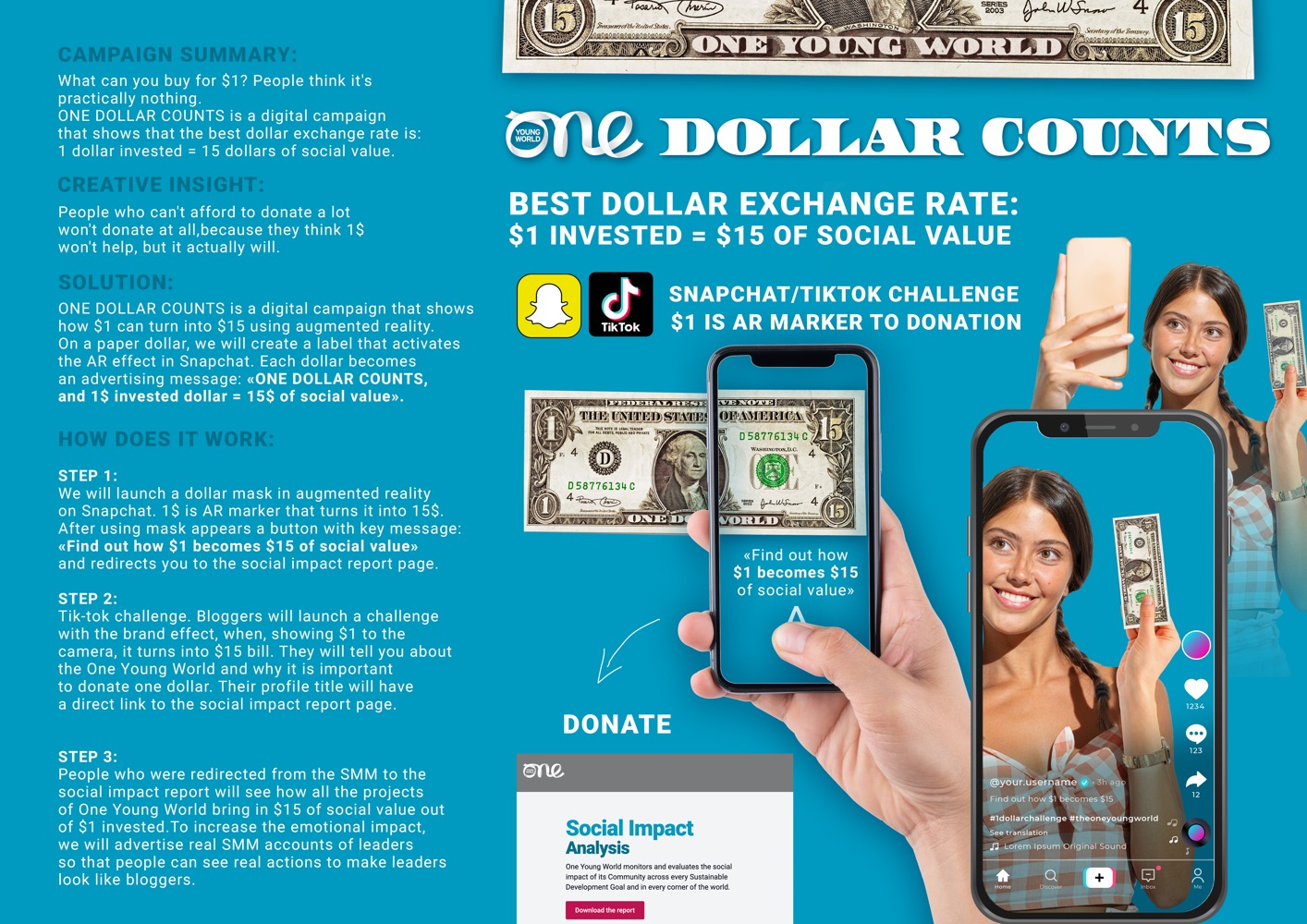 Проанализировав успешные кейсы других организаций, мы нашли интересный факт,что маленькие пожертвования намного полезнее регулярностью и большей отдачей,чем крупные разовые госдонейшены, и решили построить на этом свою стратегию.Тут сложилось несколько фактов и нейминг. Мы решили взять только массовуюаудиторию и собирать со всех по доллару (one dollar — One Young World —все легло в концепт).Если посмотреть на наш борд, не все поймут, почему их доллары превращаютсяименно в $15. Тут надо знать бриф. У организации хитрая формула, где онирассчитывают полезность от проектов. На данный момент это $1=$15 social value.Эту формулу мы и выбрали для визуализации в механике. Использовали несколькоформатов: TikTok Challenge и маску Snapchat как наиболее популярные массовыеформаты. В чем же фишка работы? Все просто.