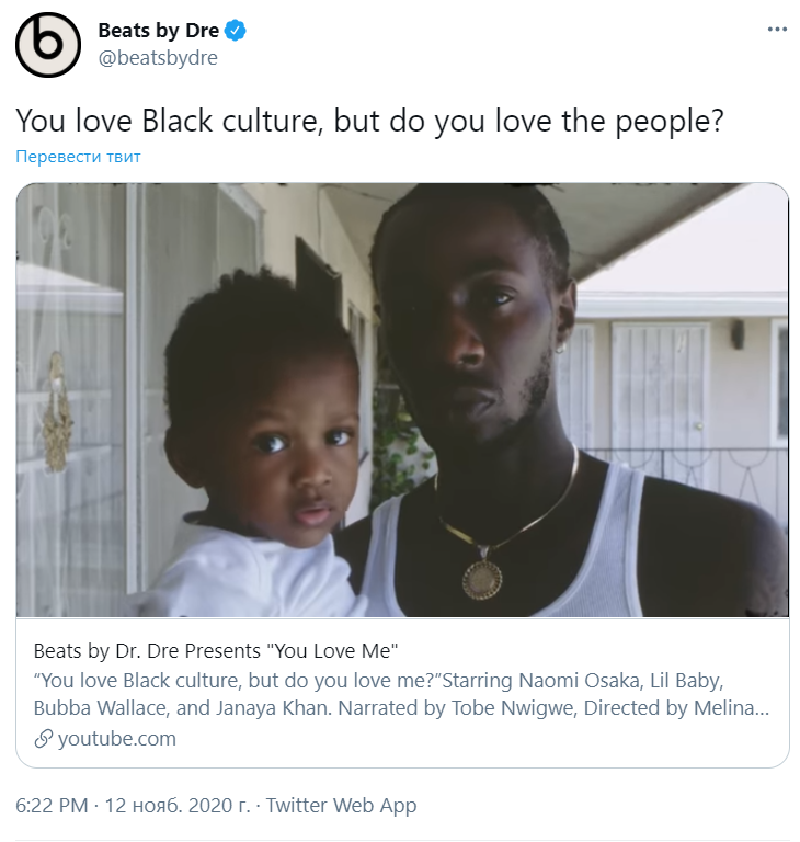 Мини-фильм от бренда Beats by Dr. Dre задает важный вопрос: вы любитехип-хоп, вы любите культуру черных, но любите ли вы людей, создавших ее?Поводом для запуска кампании стало движение BLM, которое вскрыло болезненнуюдля всего американского общества тему.