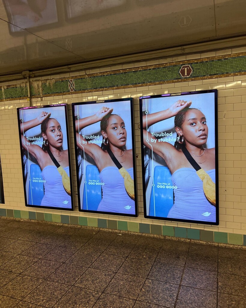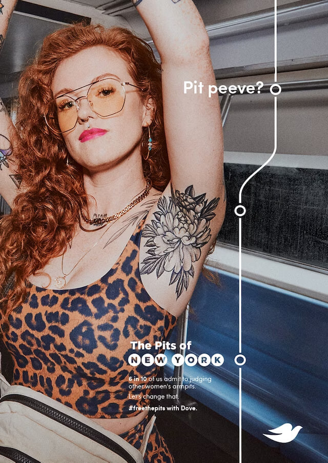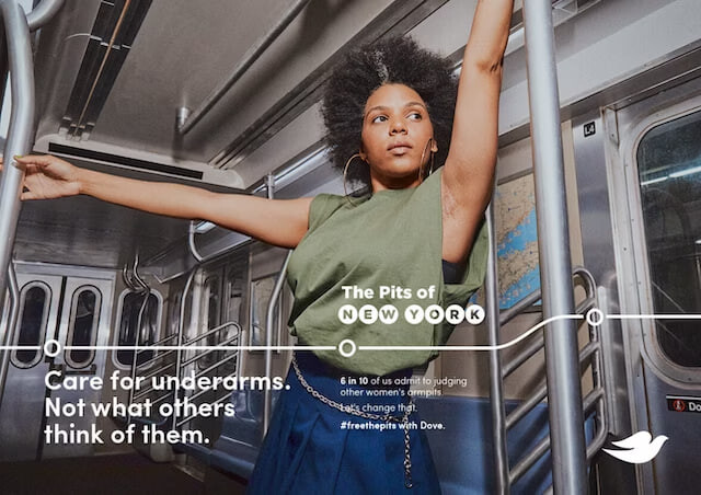 Бренд в партнерстве с креативным агентством Ogilvy разместил в метроНью-Йорка баннеры с женщинами, которые не стесняются своего тела. Передкампанией Dove провел исследование, где выяснилось, что 8 из 10 женщин ненравится, как они выглядят, когда ощущают потные подмышки. Еще 6 из 10 женщинпризнались, что судят других по их подмышкам.
