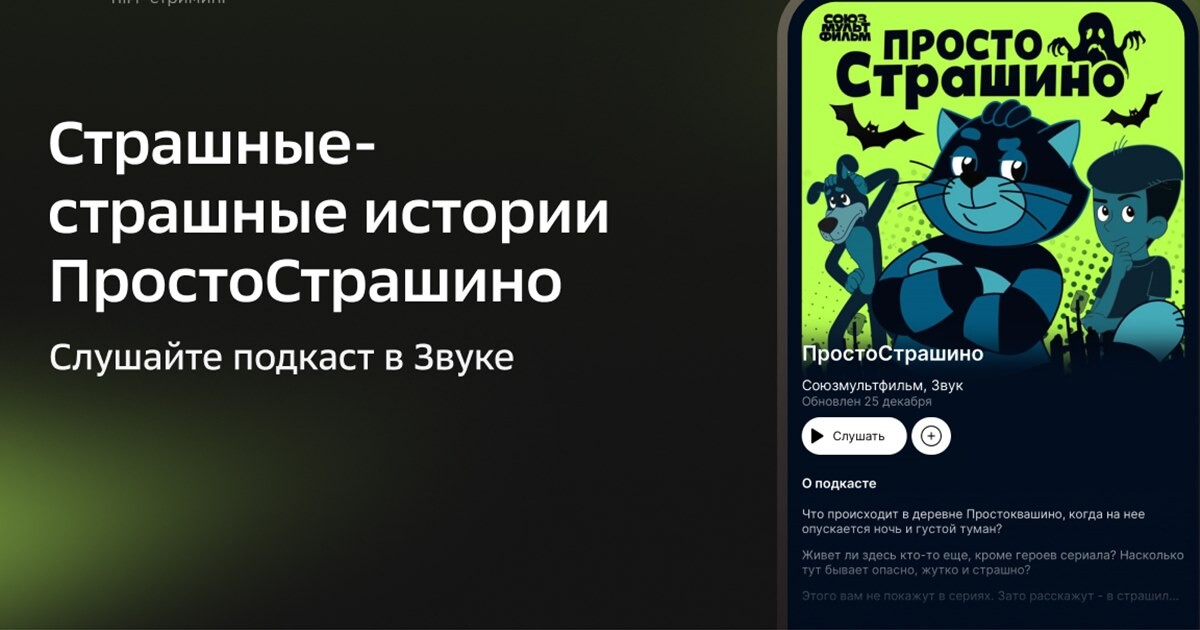 HiFi-стриминг «Звук» совместно с «Союзмультфильмом» выпустил аудиосериал«ПростоСтрашино» с героями из мультфильма «Простоквашино». Историивдохновлены атмосферой «Гравити фолз» и сериала «Очень странныедела».