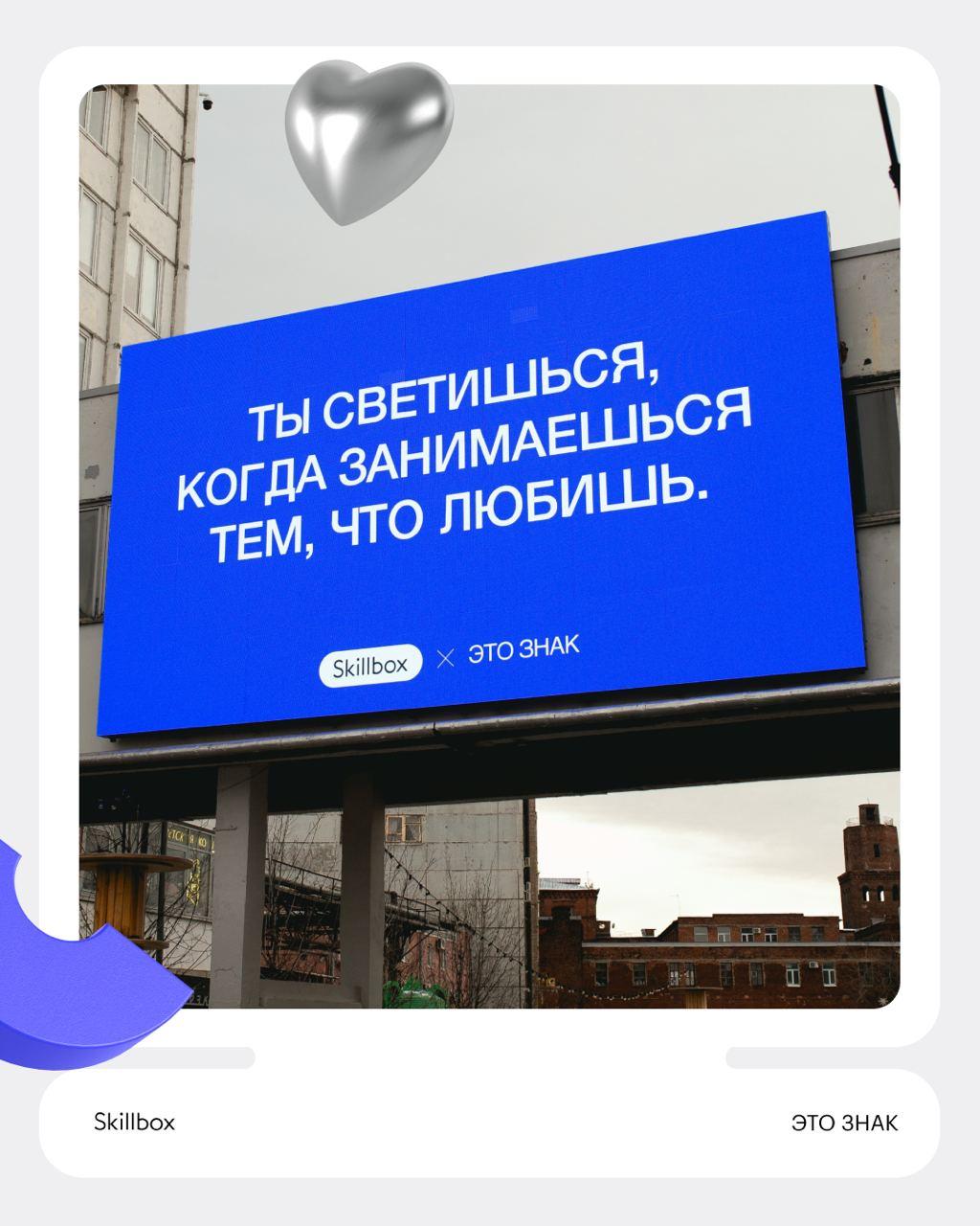 Skillbox и «Это знак» ко Дню святого Валентина разместили серию баннеров вСевкабель Порт о том, как важно найти любимую работу. «Ты светишься, когдазанимаешься тем, что любишь», — гласит один из билбордов.
