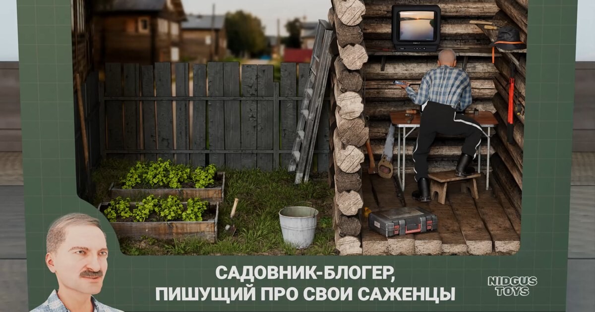 Архетипы состоят из собирательных образов блогеров и их рабочих мест: сначала нулевых и до современности. Например, автор первых текстовых блоговпишет материал на компьютере с Windows XP в обстановке квартиры 90-х с чешскиммебельным гарнитуром. А садовник-блогер рассказывает аудитории про саженцы, неотходя от грядки, — его компьютер стоит в бревенчатом дачном домике.