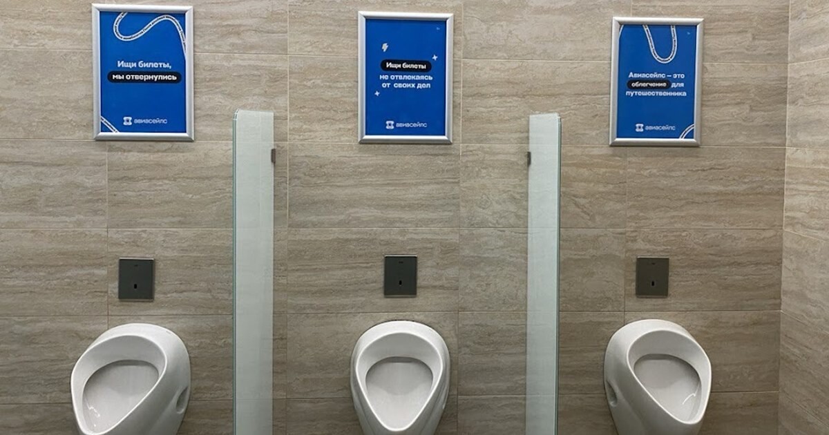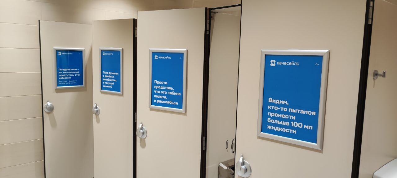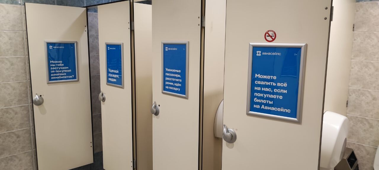 Как рассказали в «Авиасейлс», компания выбрала туалетные комнаты ваэропортах в качестве плейсмента, так как такая реклама направлена на целевуюаудиторию сервиса — путешественников. А также не конкурирует за вниманиепользователя в сравнении с более стандартными местами размещения, например сбилбордом в зоне ожидания.