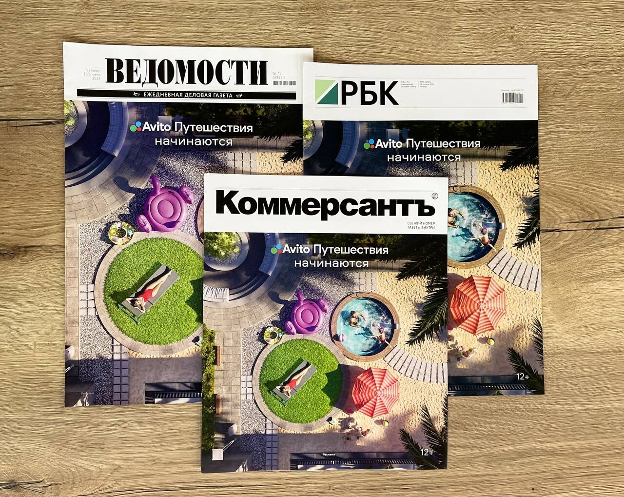 Сервис «Авито Путешествия» разместил свою рекламу на первых полосах трехделовых изданий — РБК, «Ъ» и «Ведомости». Новые выпуски газет вышли содинаковыми обложками, рассказали в пресс-службе компании.