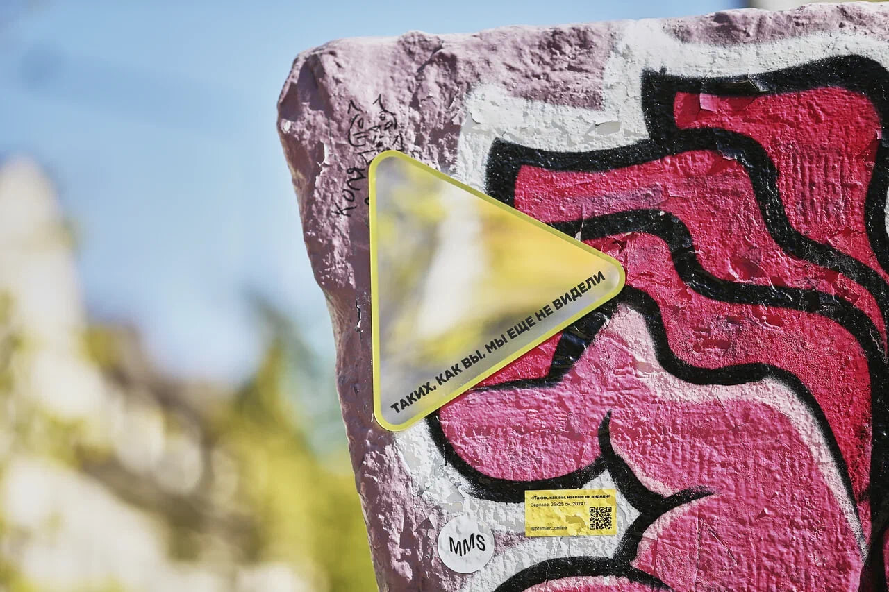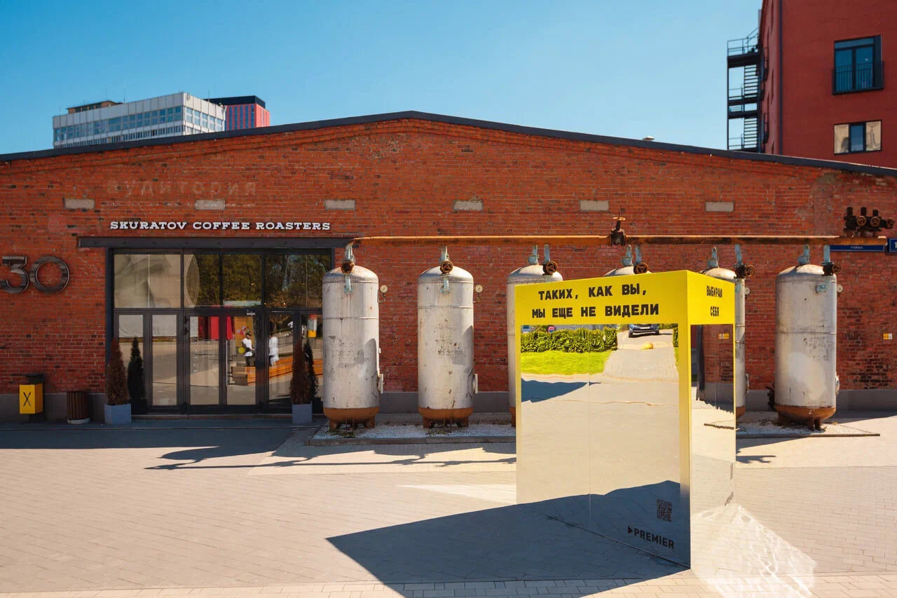 На Хлебозаводе Premier установил зеркальный трехгранник в форме кнопки«плей», где на каждую грань нанесли вдохновляющие фразы.