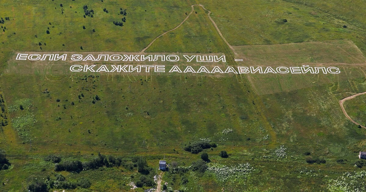 Надпись «Ааааавиасейлс» появилась в поле под Санкт-Петербургом, ее видно изиллюминатора при взлете и посадке в международном аэропорте Пулково. Причем вночное время она тоже хорошо читается. Сервис советует громко кричать это словопри посадке или взлете, чтобы не закладывало уши.