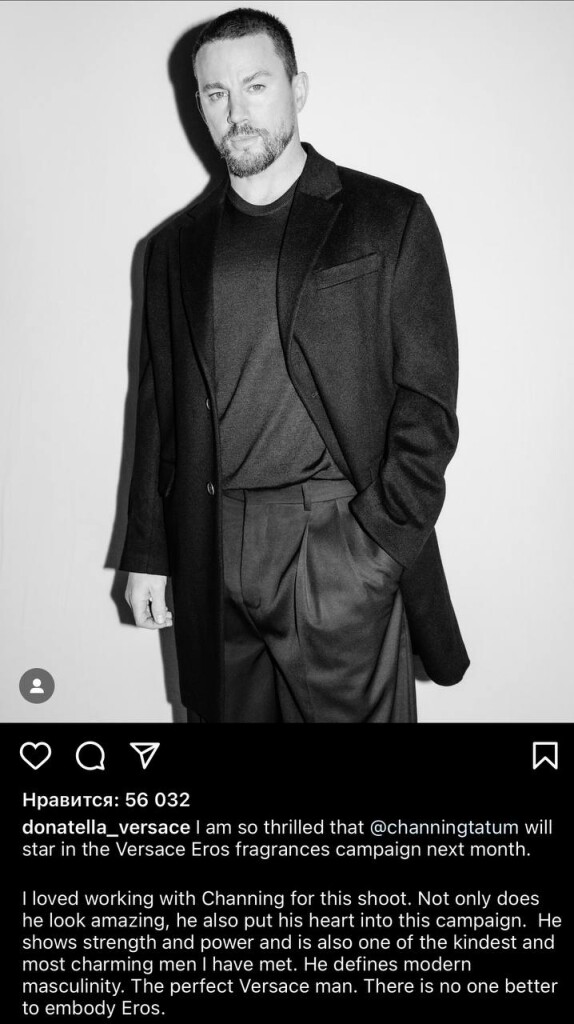 Донателла заявила, что Татум «олицетворяет современную мужественность», атакже он «идеальный мужчина от Versace».