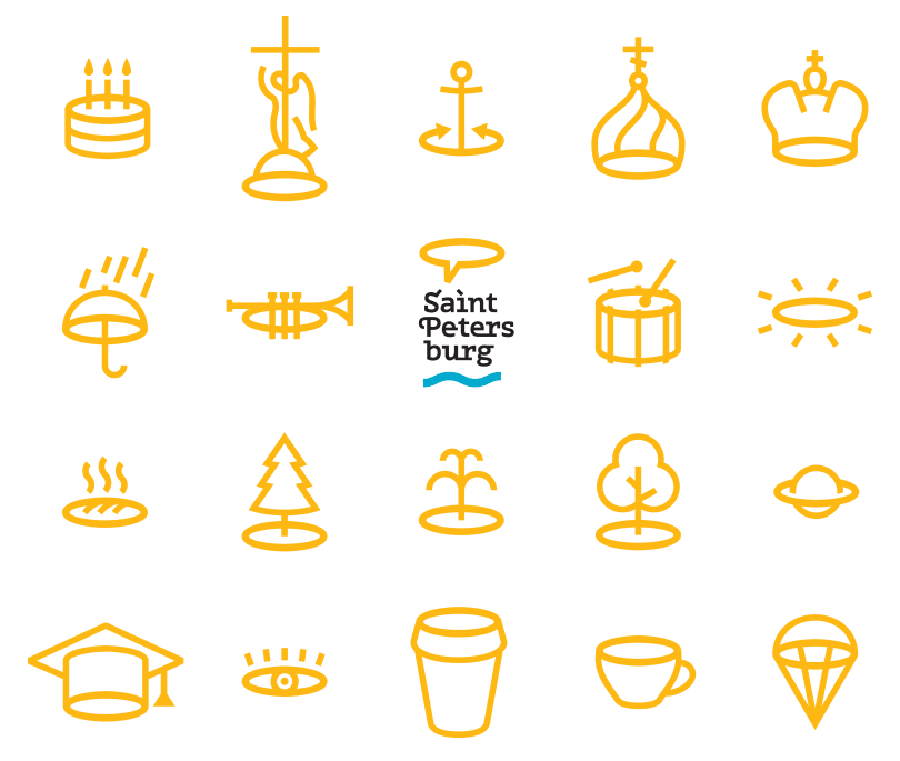 'Создан целый набор знаков про интересные, приятные и незабываемые для гостей стороны жизни Питера. Каждый знак — ясный и выразительный символ, основанный на овале', - сообщается на сайте студии. Все логотипы существуют в английской и русской версиях.