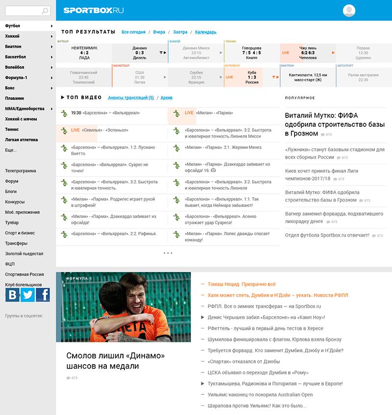Фейслифт было решено запускать по частям, так как так удобнее и для пользователей, и для технической команды. Сейчас обновлены только главная страница, разделы по видам спорта, новости и фотогалереи. На остальных страницах изменилась только ширина колонок и гарнитура шрифта.