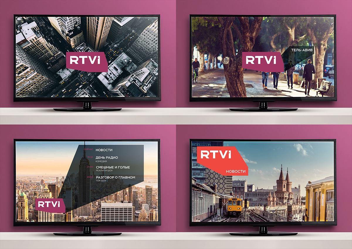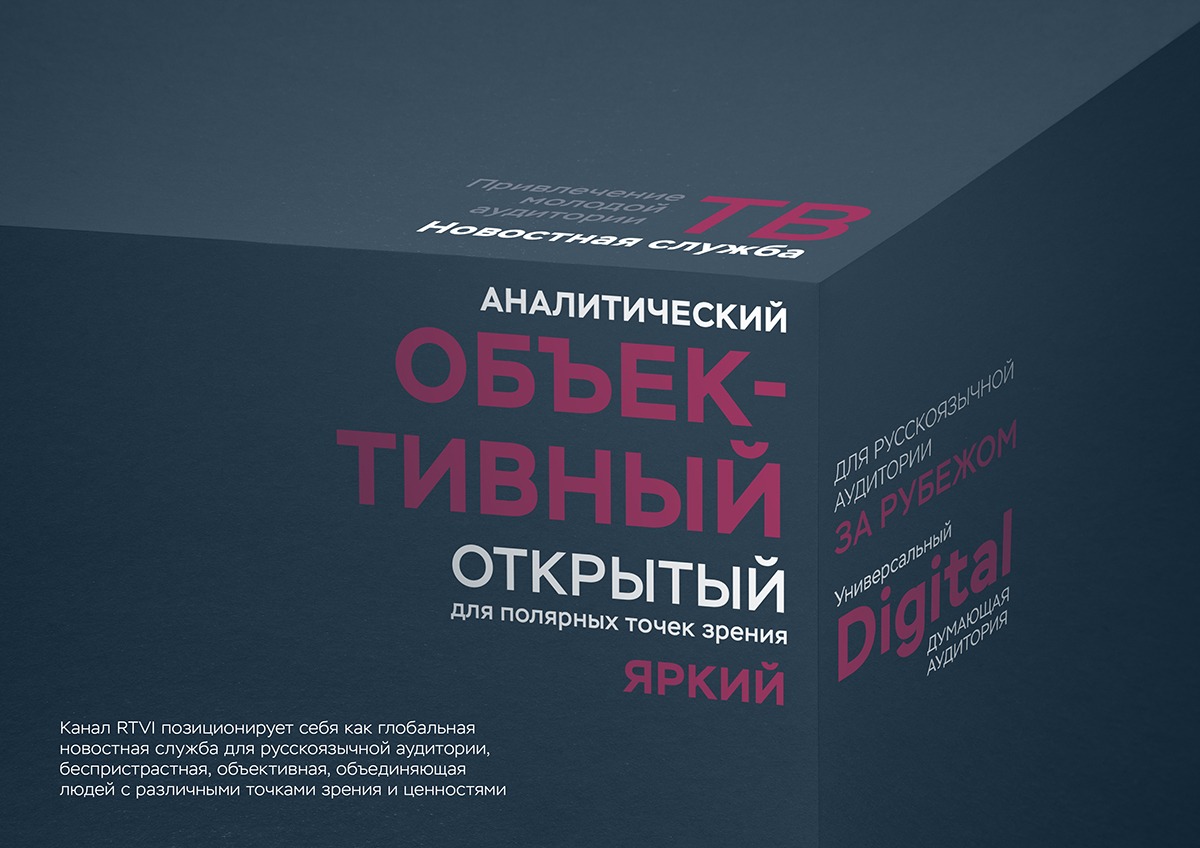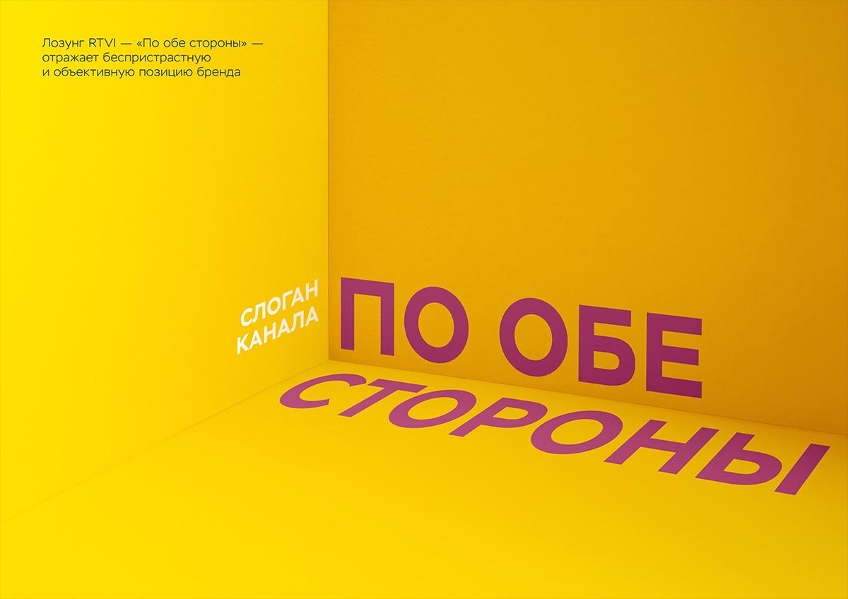 Телеканал RTVi представил новый фирменный стиль, появление которого приурочено к перезапуску канала в июне. Фирстиль подготовила петербургская студия DEZA. Новый слоган RTVI – «По обе стороны»