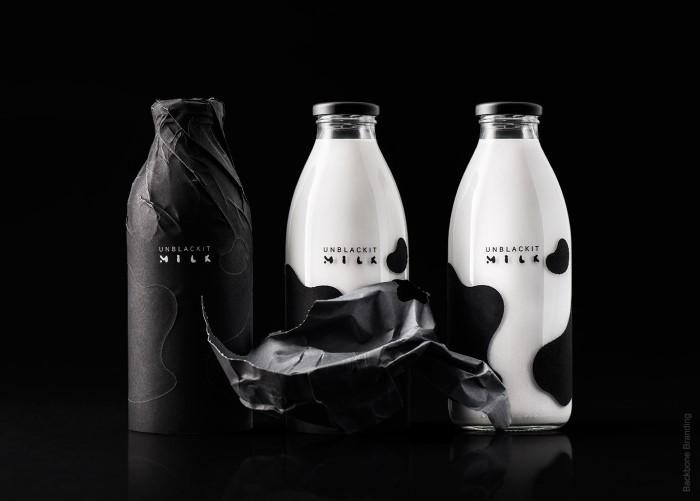 Армянское агентство Backbone Branding придумало концепт Unblackit. Черная оберточная бумага, под которой скрывается белоснежное молоко. За счет перфорации на бутылке появляется узор, напоминающий окрас коровы. Упаковка призвана выделить продукт на магазинной полке и заинтриговать покупателя.
