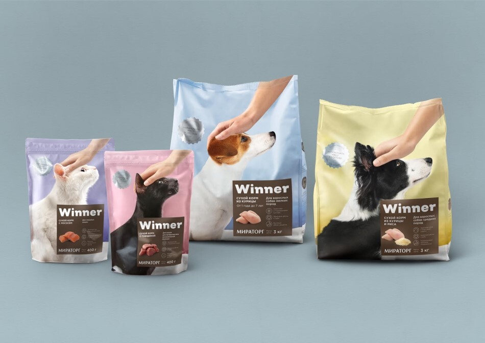 Брендинговое агентство «Ферма» разработало позиционирование, название идизайн для кормов премиум-класса Winner производства«Мираторг». Дизайн упаковки метафорически переосмысливает понятие «победитель».Для каждого хозяина его питомец является чемпионом не из-за медалей и наград, аиз-за искренней любви к своему человеку.