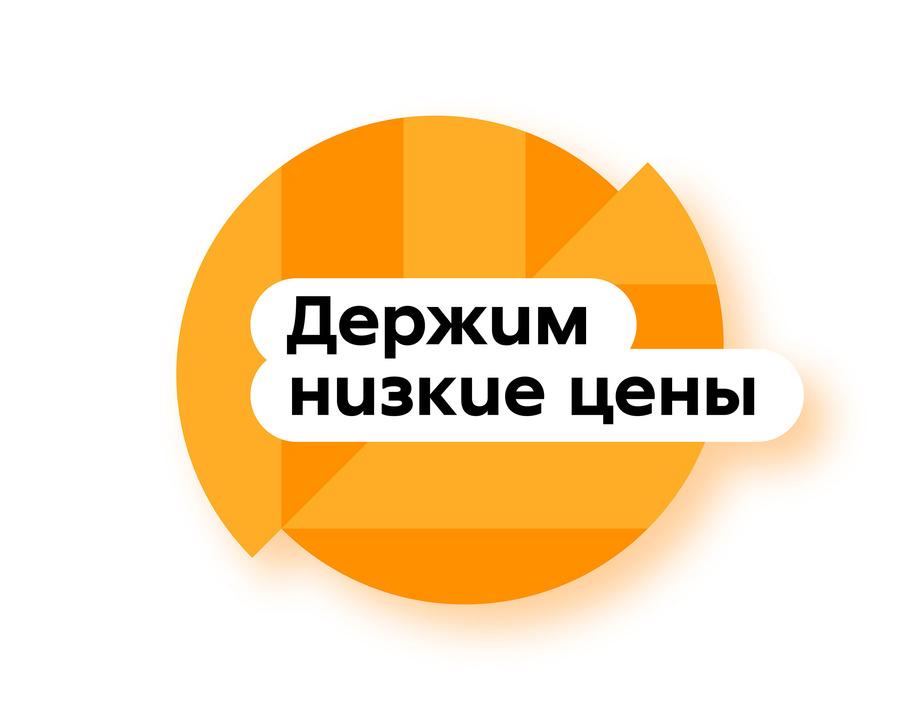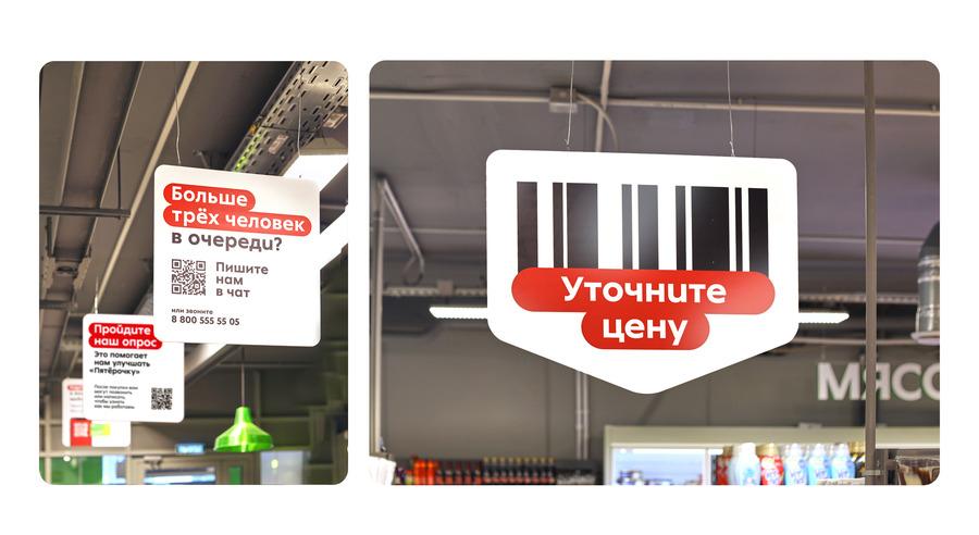 На входе в магазины располагаются подвесы с фразами «Держим низкие цены»,«Гарантия свежести», «Искренняя забота» в оранжевом, зеленом и красном цветах.Эти элементы знакомят покупателей с ключевыми цветами и навигациейпространства.