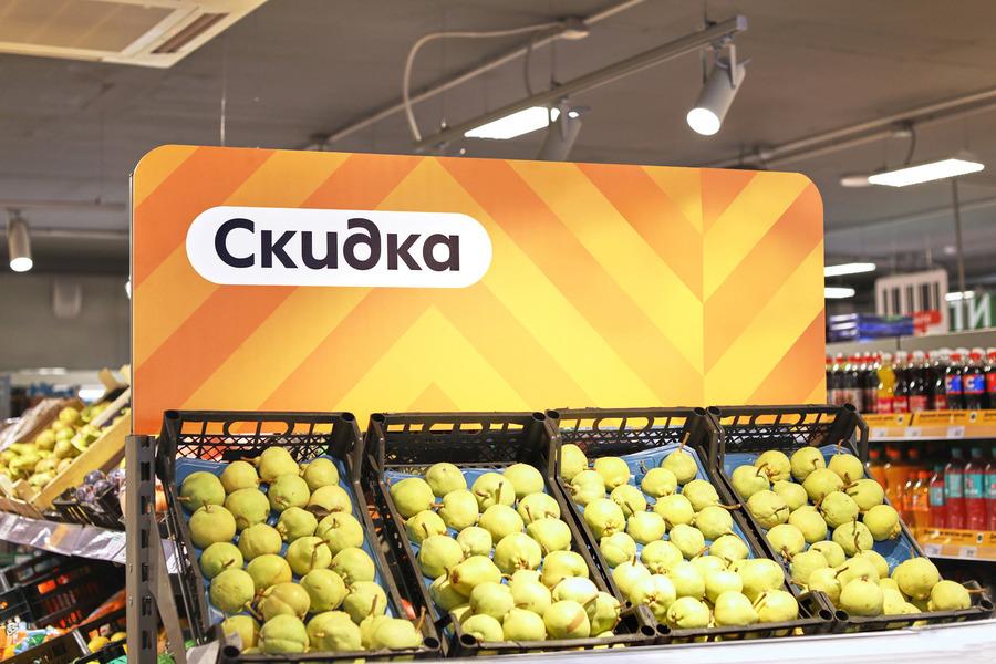 Оранжевый «скидочный» подвес выполнен в форме круга, начерченного пополам, ивизуально напоминает символ процента. Для облегчения навигации на боковинахакционных стеллажей написано «Скидка». Зеленая «свежесть» напоминаетлист.