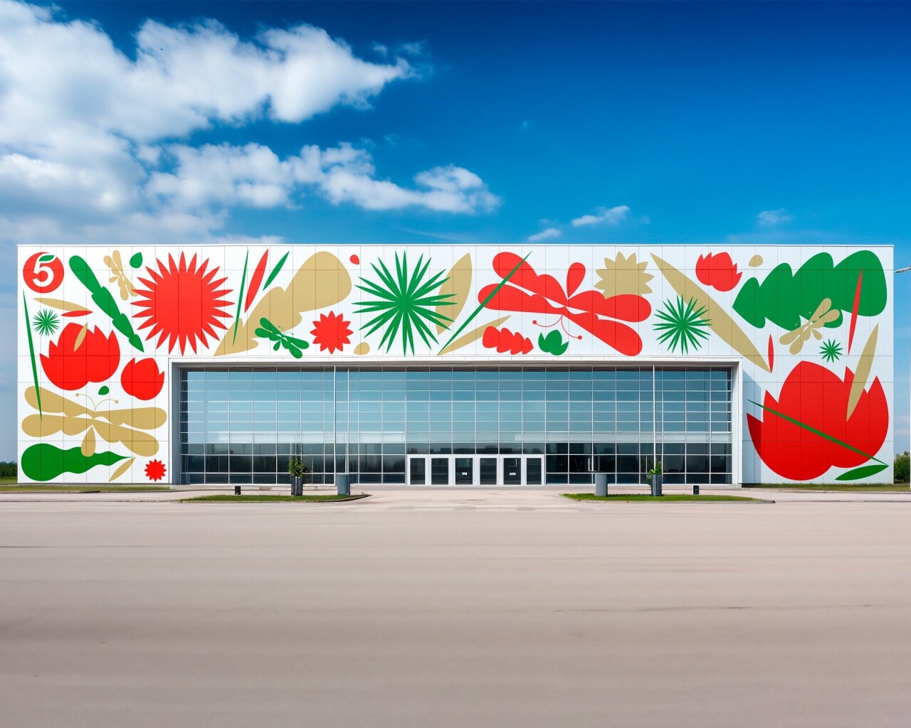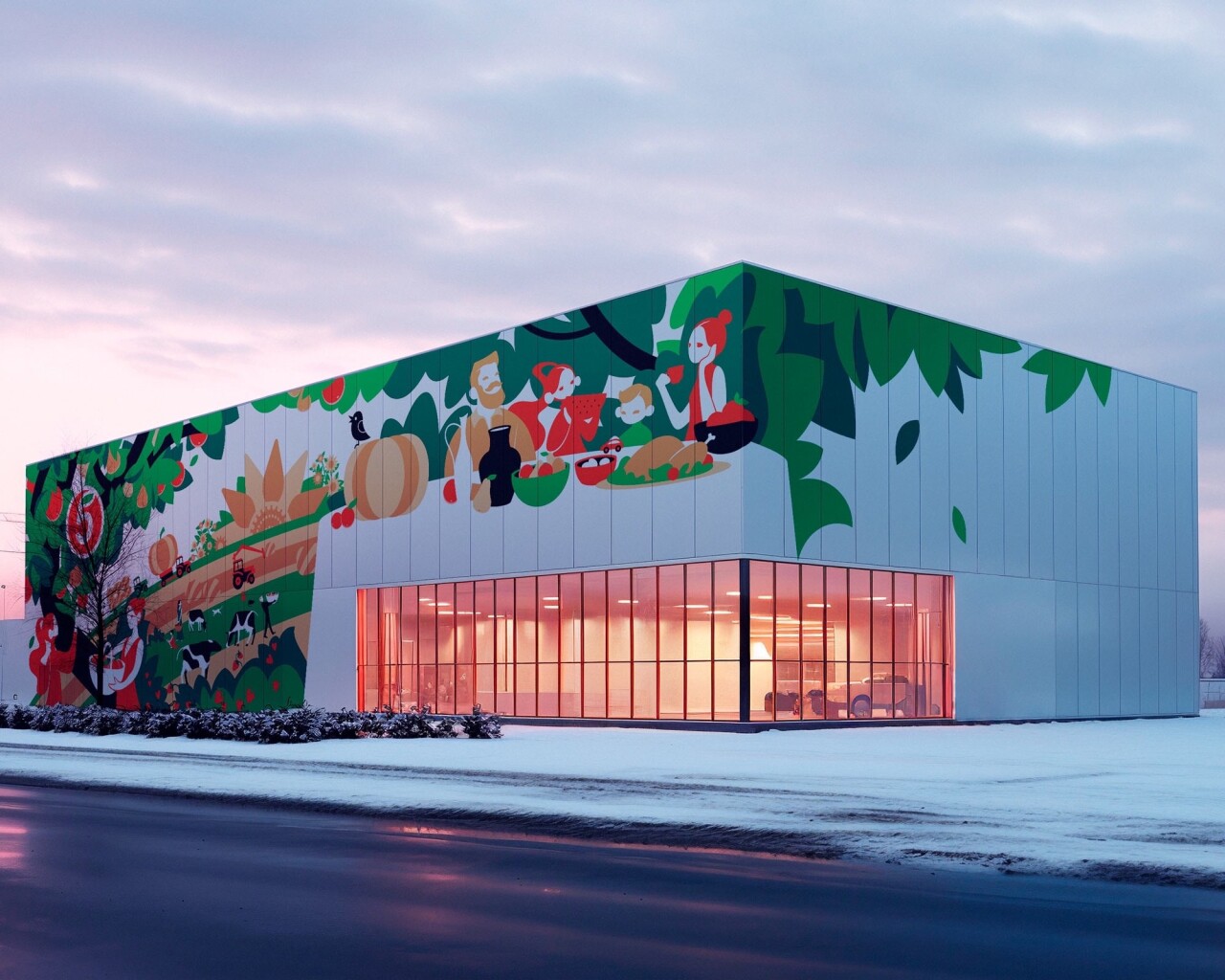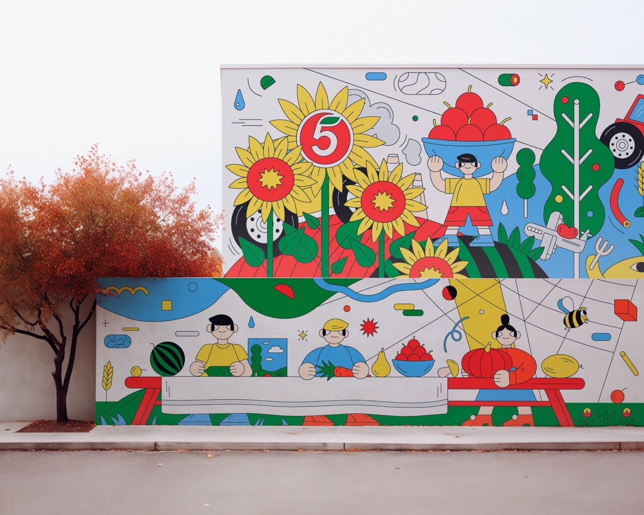 Также создан гибкий вариант дизайна, который может подойти фасадамлюбой конфигурации. Там использовали «степной» паттерн. Кроме того, в студиипридумали концепцию муралов с «урожайными» образами в желтых, голубых, красныхи зеленых цветах.