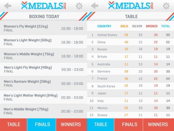 Medals 2012, что закономерно вытекает из названия, ведёт подсчет медалей каждой страны и показывает расписание всех церемоний награждения.