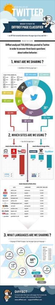 Специальная программа обработала 750 тысяч ссылок, чтобы ответить на 3 ключевых вопроса: чем мы делимся с друзьями, на каком языке и какие сайты для этого используем. Почему-то типичным жителем Twitter оказался британец, который преимущественно постит фоточки со своим котиком и делится прочитанными статьями BBC