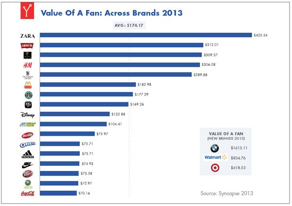 В результате выяснилось, что, в сравнении с 2010 годом, к 2013-му сумма, в которую обходятся брендам «лайки» на Facebook, выросла на 28% и составила в среднем $174. Также исследование выявило, что бренды, на чью продукцию установлена сравнительно низкая розничная цена, и на «лайки» тратят меньше. Например, Coca Cola тратит в среднем на один «лайк» $70. Зато брендам, продающим роскошный образ жизни, приходится самим раскошеливаться в Facebook. Согласно исследованию, BMW тратит на один «лайк» $1613.