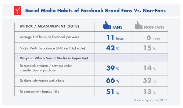 Если говорить о разнице в поведении тех пользователей Facebook, которые подписались на страницы разных брендов, то они на 80% больше склонны быть приверженцами брендов, чем не-подписчики. Также они тратят на товары брендов на 43% больше, на 18% больше удовлетворены своим взаимодействием с брендами, и на 11% больше склонны продолжать это взаимодействие в дальнейшем.
