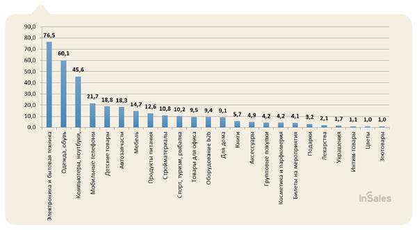 Самыми популярными категориями товара по обороту в 2012 году стали: «Электроника и бытовая техника» (76,5 млрд рублей), «Одежда, обувь» (60,1 млрд рублей), «Компьютеры, ноутбуки, комплектующие» (45,6 млрд рублей) и т.д.