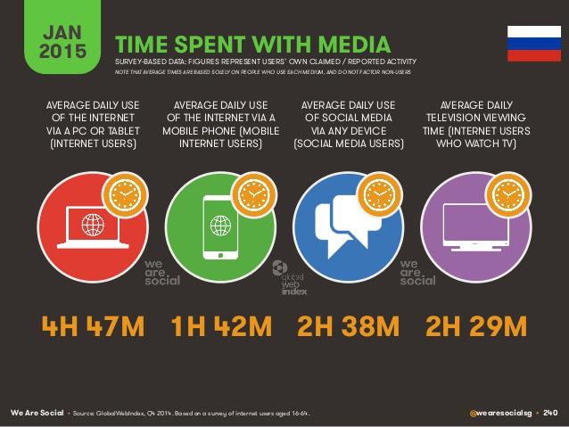 По данным We Are Social, российские интернет-пользователи в среднем проводят за настольным компьютером почти пять часов в сутки и около двух часов занимаются сёрфингом сети со смартфона или планшета. Среднее время пребывания в соцсетях превысило среднее время просмотра телевизора и составляет два часа и 38 минут.