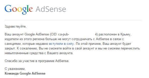 Компания Google разослала письмо крымским пользователям рекламной платформы, в котором сообщила, что в связи с санкциями, вступившими в силу, закрывает их аккаунты