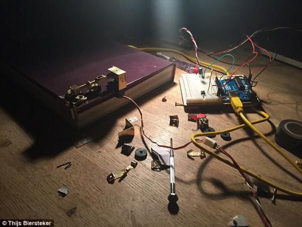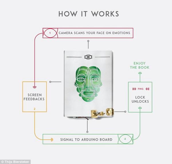 Также создатели разместили на обложке абстрактное лицо, под линии которого пользователь должен подстроить свое. Нейтральное выражение запускает микроконтроллер Arduino, который открывает замок на книге.