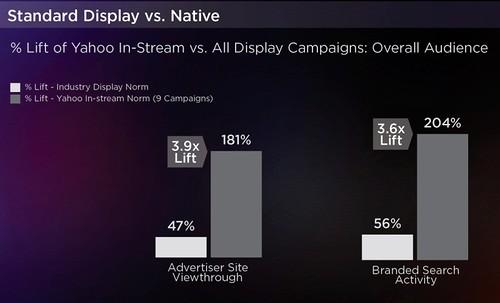 Нативная реклама, по данным Yahoo, намного лучше традиционной медийки с точки зрения привлечения трафика на сайт, что, впоследствии, позитивно сказывается и на поисковой активности пользователей: количество брендированных поисковых запросов выросло на 204%.