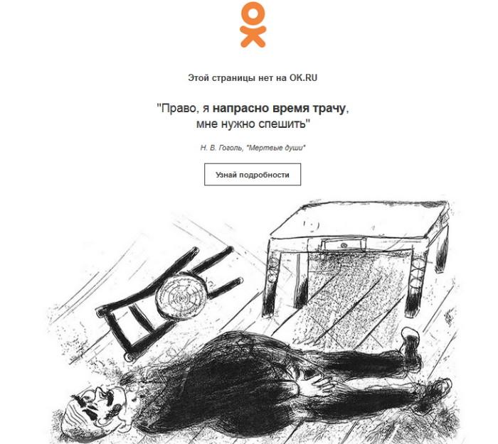 Когда пользователь попадает на несуществующую страницу http://www.ok.ru/404, то вместо привычной надписи «Ошибка 404» он видит цитаты из русской классики и иллюстрации. Например: