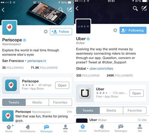 Пользователи заметили, что сервис микроблогов позволил некоторым брендам прикреплять приложения непосредственно к своим страницам профилей в приложении Twitter для iPhone. Изменения были замечены в некоторых бизнес-аккаунтах, включая Periscope, Vine и Uber